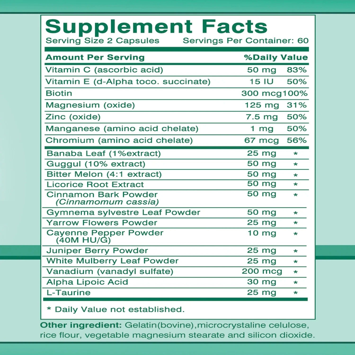 | Key Ingredients | Vitamin C, Gymnema Sylvestre, Alpha Lipoic Acid, Cinnamon, Cayenne |